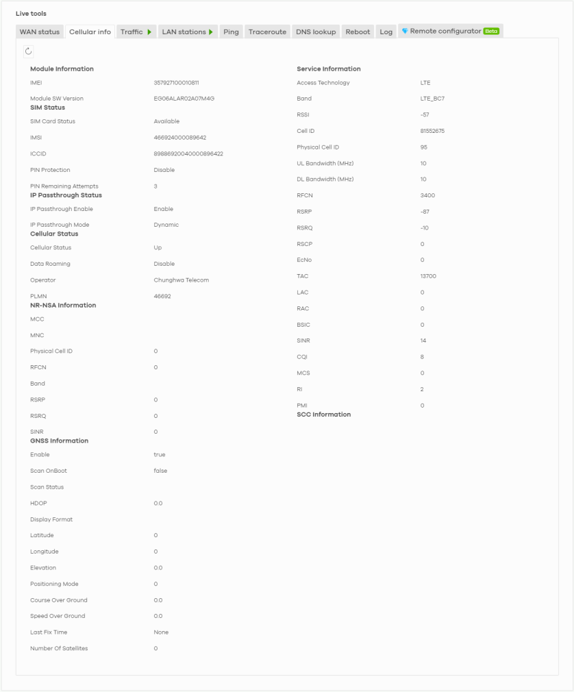Service Information | If the cellular service provider supports carrier aggregation (CA), then this section displays statistics for the connection’s primary component carrier (PCC). |