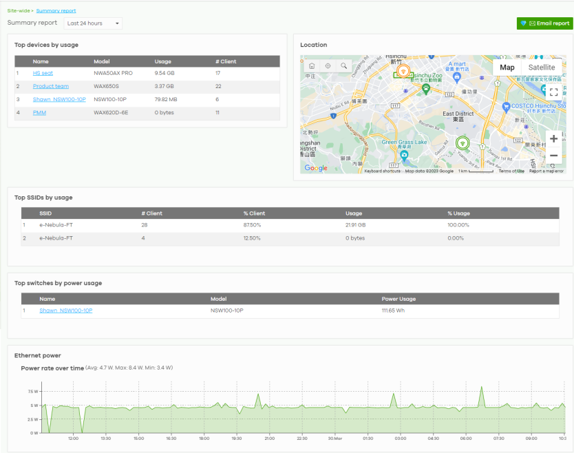 Ethernet power | This graph shows power used by all PoE Switch ports in the site within the specified time, in Watts. |