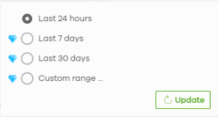 Summary report | Select to view the report for the past day, week or month. Alternatively, select Custom range... to specify a time period the report will span. You can also select the number of results you want to view in a table. ![]() |