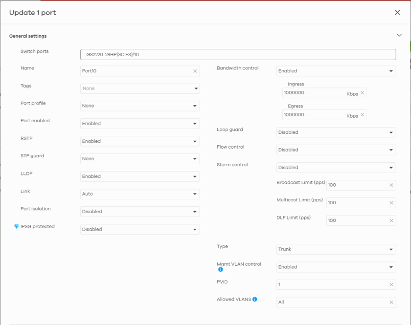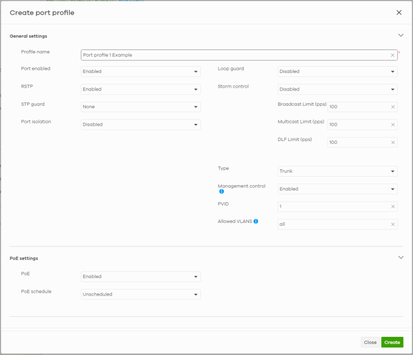 Port profile | Select the port profile you created in Site-wide > Configure > Switches > Port profiles > Create port profile and make sure to enable this port profile to apply to this port. |