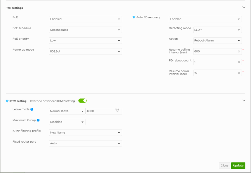 Auto PD recovery | Select to enable or disable automatic PD recovery on the port. Automatic PD recovery allows the Nebula Device to restart a Powered Device (PD) connected to the port by turning the device on and off again. |