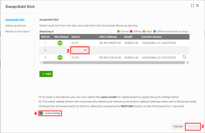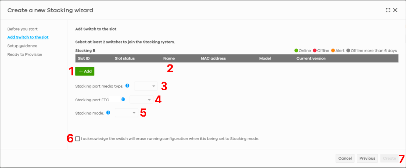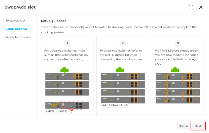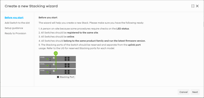 Port mirroring | Click Add to create a new entry. Select the Nebula Device/stacking system for which you want to configure port mirroring, specify the destination port you copy the traffic to in order to examine it in more detail without interfering with the traffic flow on the original ports, and also enter the source port on which you mirror the traffic. If the port is on a stacking Nebula Device, enter the slot ID/port number to specify the destination and source ports. For example, to specify slot ID 2 port 20 in a stacking system, enter ‘2/20’. |