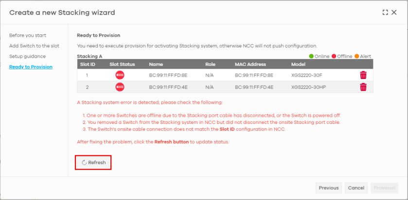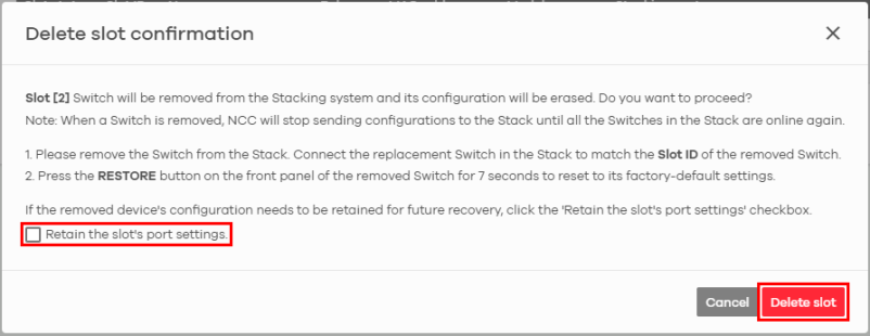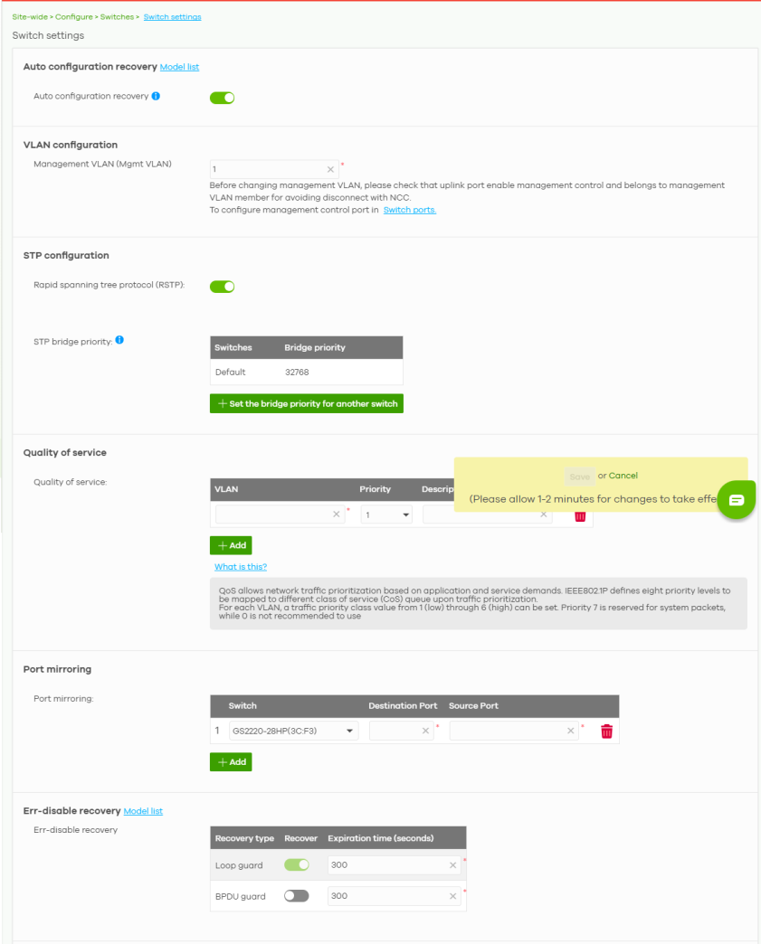 Auto configuration recovery | When On, connectivity check to NCC is done 5 minutes after any configuration change. If an NCC connection problem is detected, the Nebula Device will return to its last saved custom default configuration. The Nebula Device will be locked by NCC and the banner N Switches are currently protected by Auto Configuration Recovery will be displayed. Otherwise, the latest configuration will be saved as the new custom default configuration. |