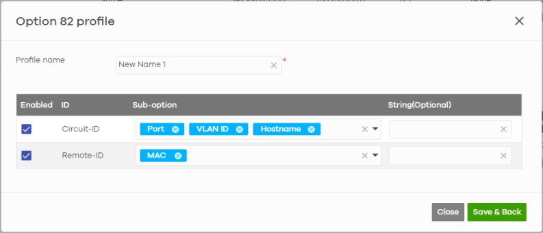 Remote-ID | Use this section to configure the Remote ID sub-option to include information such as the MAC address (in hexadecimal format) that is specific to the DHCP relay agent (the Nebula Device). For example: ‘bccf4f000001custom’. Where: • ‘bccf4f000001’ is the MAC address • ‘custom’ is the optional string. See String (Optional) for more information. |