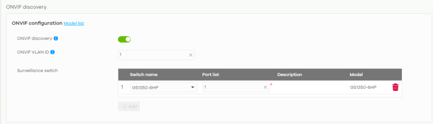 + Add | Click this to configure ONVIF discovery on another Nebula Device in the site. |
