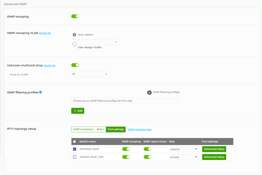 Port settings | Click Advanced setup to open the Port settings screen, where you can change IGMP leave mode and IGMP filtering profile for the ports on the Nebula Device. See IGMP Port Settings. |