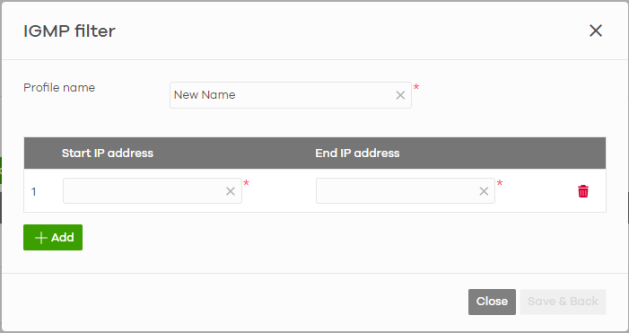 Start IP address | Enter the starting multicast IP address for a range of multicast IP addresses that you want to belong to the IGMP filter profile. |