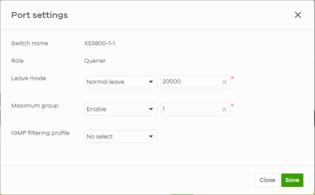 Leave mode | Select Immediate Leave to remove this port from the multicast tree immediately when an IGMP leave message is received on this port. Select this option if there is only one host connected to this port. Select Normal Leave or Fast Leave and enter an IGMP normal/fast leave timeout value to have the Nebula Device wait for an IGMP report before the leave timeout when an IGMP leave message is received on this port. You need to specify how many milliseconds the Nebula Device waits for an IGMP report before removing an IGMP snooping membership entry when an IGMP leave message is received on this port from a host. In Normal Leave mode, when the Nebula Device receives an IGMP leave message from a host on a port, it forwards the message to the multicast router. The multicast router then sends out an IGMP Group-Specific Query (GSQ) message to determine whether other hosts connected to the port should remain in the specific multicast group. The Nebula Device forwards the query message to all hosts connected to the port and waits for IGMP reports from hosts to update the forwarding table. In Fast Leave mode, right after receiving an IGMP leave message from a host on a port, the Nebula Device itself sends out an IGMP Group-Specific Query (GSQ) message to determine whether other hosts connected to the port should remain in the specific multicast group. This helps speed up the leave process. |