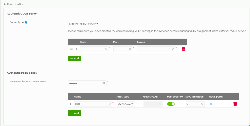 Auth. type | Select MAC-Base if you want to validate access to the ports based on the MAC address and password of the client. Select 802.1X if you want to validate access to the ports based on the user name and password provided by the client. |