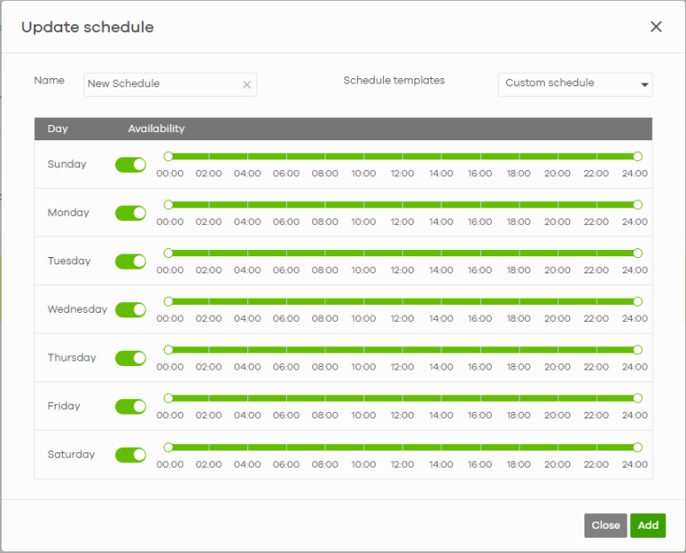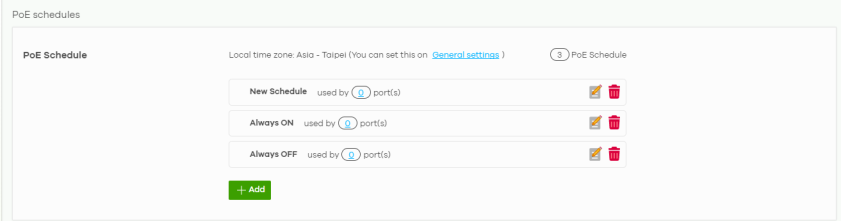 Schedule templates | Select a pre-defined schedule template or select Custom schedule and manually configure the day and time at which PoE is enabled. |