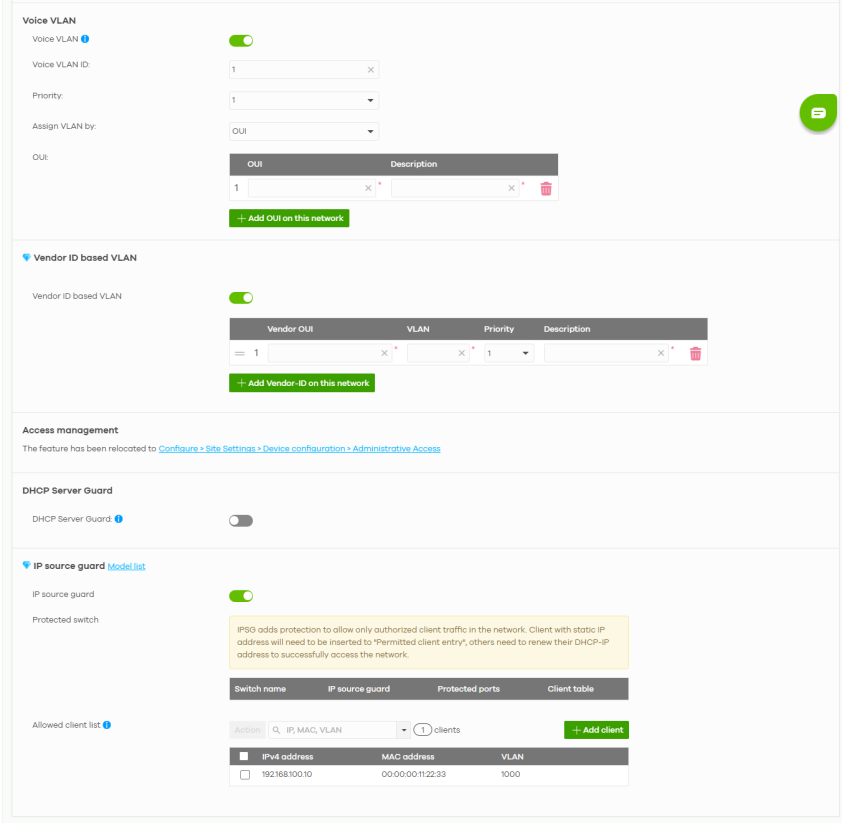 IP source guard | Select On to enable IP source guard protection. IP source guard uses a binding table to distinguish between authorized and unauthorized DHCP and ARP packets in your network. When the client does not exist in the binding table, the client is unauthorized and traffic will be blocked. To successfully access the network: • Client with static IP address will need to be added to the Allowed client list • Client with dynamic IP address will need to get their IP address from an authorized DHCP server. |