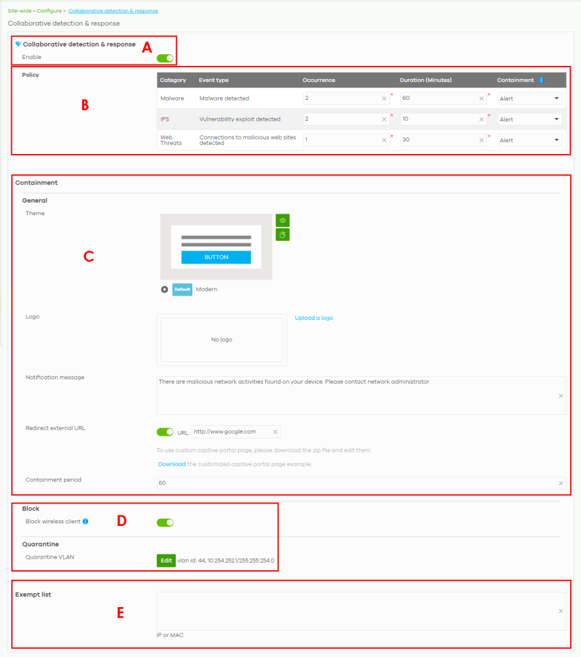 3 Configure the containment alert (Theme), customized pop-up (Notification message) for the client blocked by CDR, and the (Containment Period) time interval (refer to the C part in the above figure).