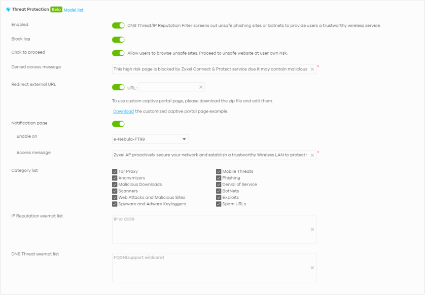 An IP address with a bad reputation is an IP address associated with suspicious activities, such as spam, virus, and phishing. These are stored in a database. IP reputation checks the reputation of an IPv4 (only) IP address from the database. When there are packets coming from an IPv4 address with bad reputation, you can set the Nebula Device to respond by blocking these packets. You can change the response action set in NCC. You can also configure an exempt list to allow packets from specific IP addresses regardless of their content rating.