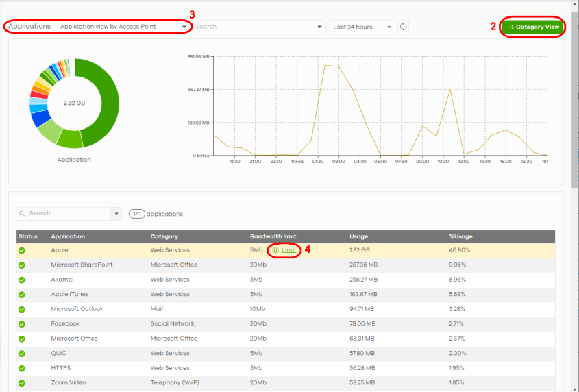 Application optimization is a way to limit the bandwidth usage of applications in the WiFi network. For example, applications that need real time traffic such as video streaming may use more resources. Use application optimization to limit the bandwidth used to stream video to prevent it from slowing down your WiFi network. Application optimization limits the applications bandwidth usage by their categories. You can manage and view the applications and their categories in Site-wide > Applications usage > Application View by Access Point.