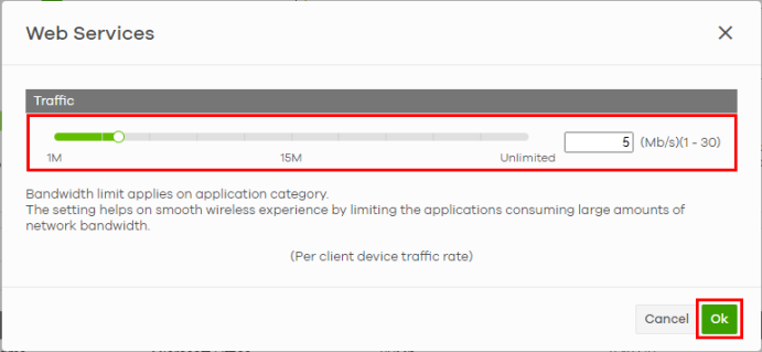 5 Use the slider or enter the Traffic allowed in Mb/s (1 – 30 or Unlimited).