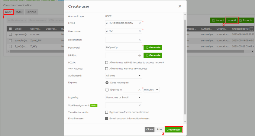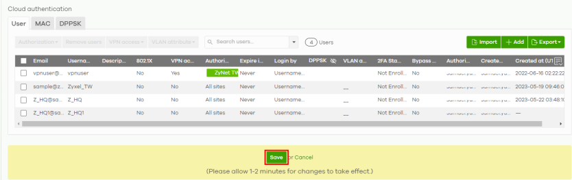 1 Go to Organization-wide > Organization-wide manage > Cloud authentication > User to view and manage the user accounts which are authenticated using the NCC user database or external RADIUS server.