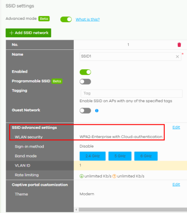 1 Go to Site-wide > Configure > Access points > SSID advanced settings.