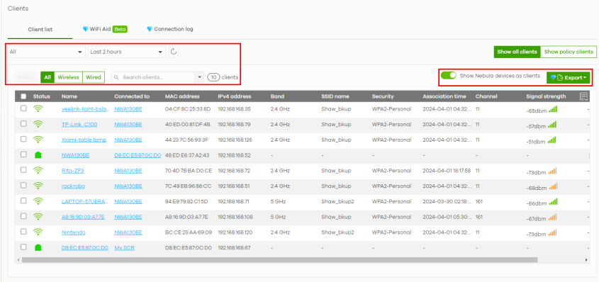 2 Select to filter the list of clients, based on what type of Nebula Device (Access point, Switch, Security router) the client is connected to. Alternatively, select All Clients.