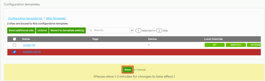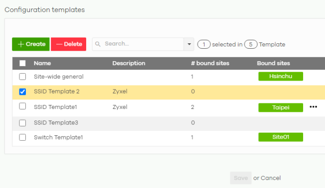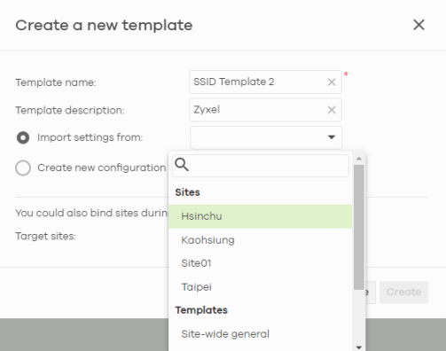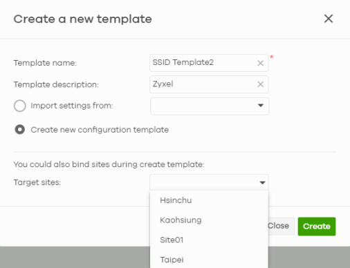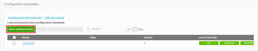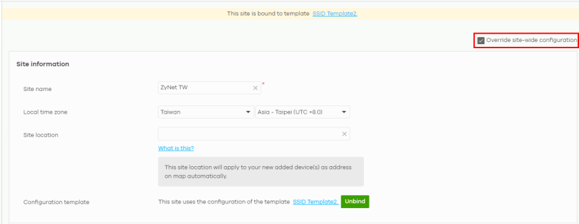 This section shows you how to use a configuration template to manage sites for your organization. Create a site and then bind a site to a template. You may enable the local override function if you want to configure some specific settings directly in a site after a site is bound to a template.