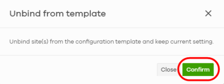 9 To release a site from using a configuration template, select a site and then click Unbind to unbind the site. The site which is unbound from the template still retains the settings applied from the template. The following screen appears. Click Confirm to confirm the changes.