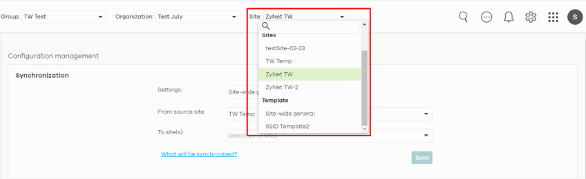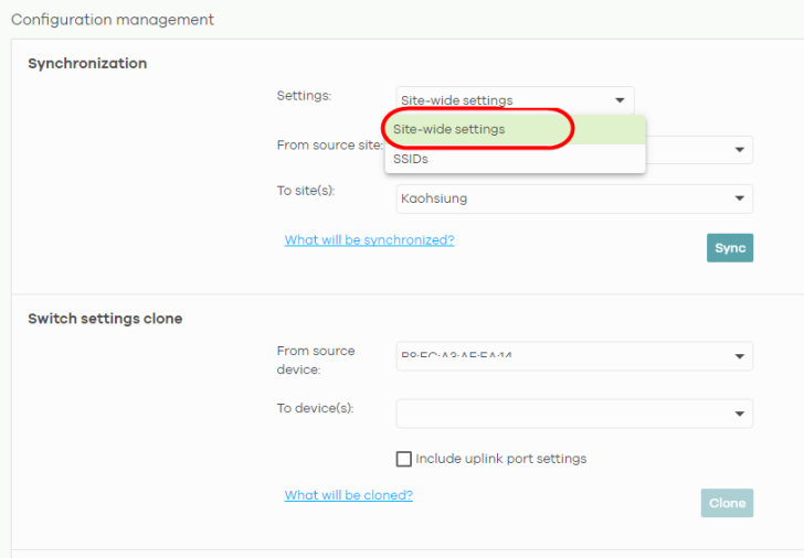 2 Go to the Organization-wide > Organization-wide manage > Configuration management screen. Under Synchronization, select the Site-wide settings in Settings to copy a site’s general setting to another site.