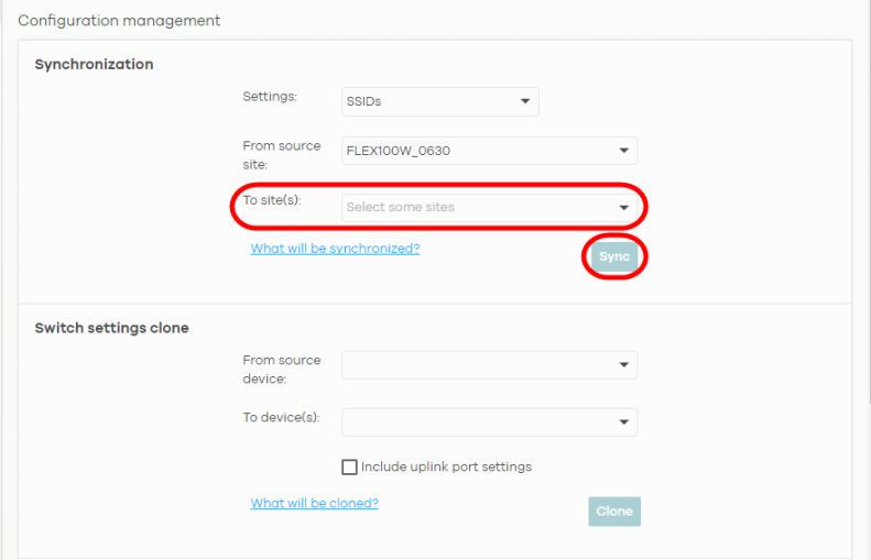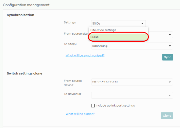 1 Go to Organization-wide > Organization-wide manage > Configuration management screen. Under Synchronization, select SSIDs to copy a site’s SSIDs settings to another site. The duplicated SSIDs include the authentication and captive portal settings.
