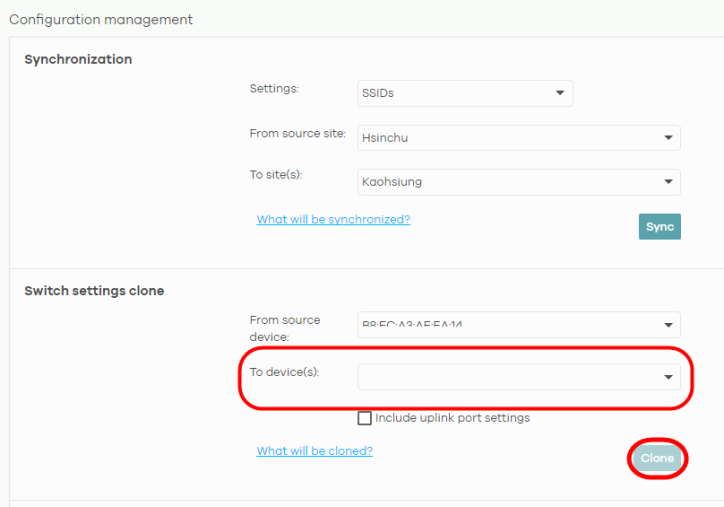 2 From the To device(s) drop-down list box, select the Nebula Device’s MAC address you want to import the Switch setting to. Click Clone to save the changes.