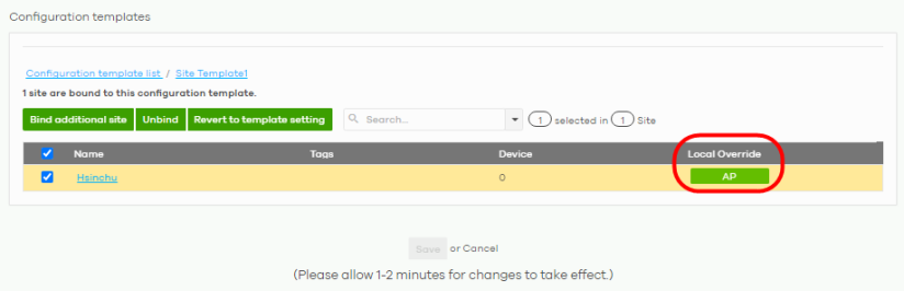 4 To verify the local override setting of a site, go to Organization-wide > Organization-wide manage > Configuration templates. The Local Override field may show that AP/SWITCH/GATEWAY/SITE-WIDE settings in the template do not apply to the site. A tag for AP, as shown in the following figure, indicates that Access Point settings have a local override and any further changes in the template’s AP settings will not be synchronized to the site.