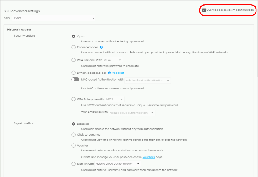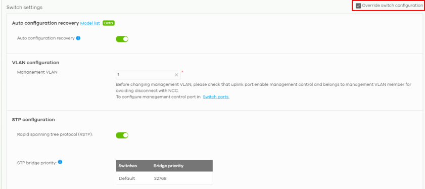 If the local override configuration is enabled on one page, all configuration pages of the Nebula Devices in the selected site will be enabled.
