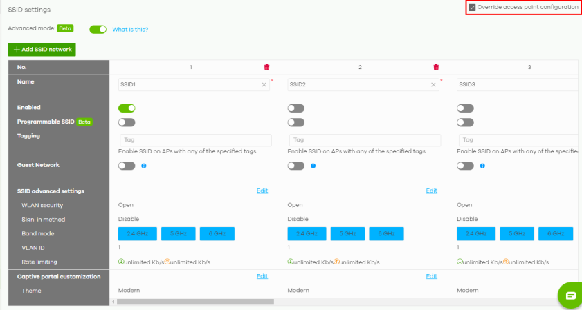 3 In Site-wide > Configure > Access point > SSID settings, edit your SSIDs, authentication or captive portal settings on the following page. Click Save to save the changes.