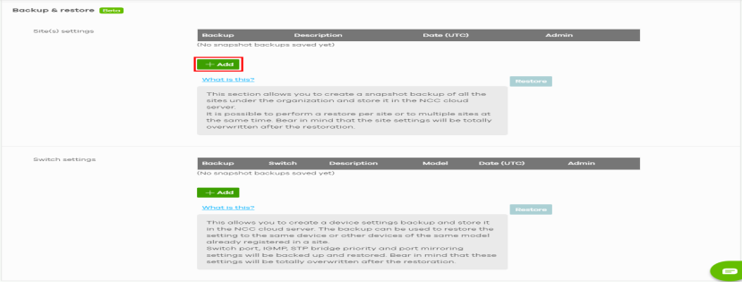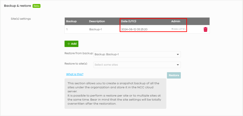 1 Go to the Organization-wide > Organization-wide manage > Configuration management: Backup & restore: Site(s) settings screen, then click +Add.