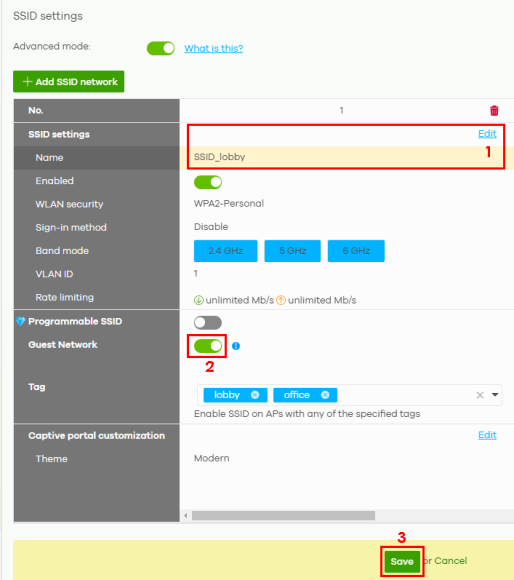 2 Change the SSID Name (1) (for example, SSID_lobby).