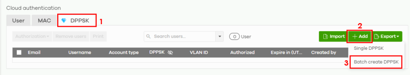 3 Click +Add (2) and then click Batch create DPPSK (3).
