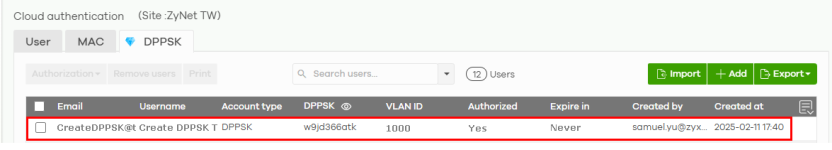 4 Go to Site-wide > Configure > Cloud authentication > DPPSK to view the new DPPSK entry.