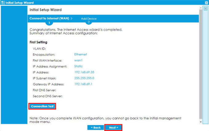 4 Click Connection Test to check that you can access the Internet and then click Next.
