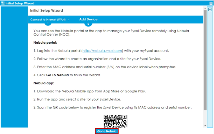 2 Use the Setup Wizard to create an organization and a site, and add the Nebula Device. See