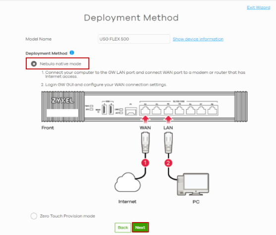 If you are adding a ZyWALL USG FLEX / ATP / USG20(W)-VPN Series Security Firewall (SF) with v5.10 and later firmware to a site, or if your SF has run ZTP before, do the following to deploy the SF using Nebula native mode: