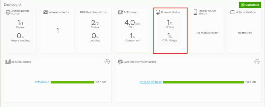 3 After configuring the Setup Wizard, close the Nebula Control Center welcome message to go to the Nebula portal dashboard. 1/1 Online will show on Firewall Status. This means that one SF is registered in Nebula and is online.