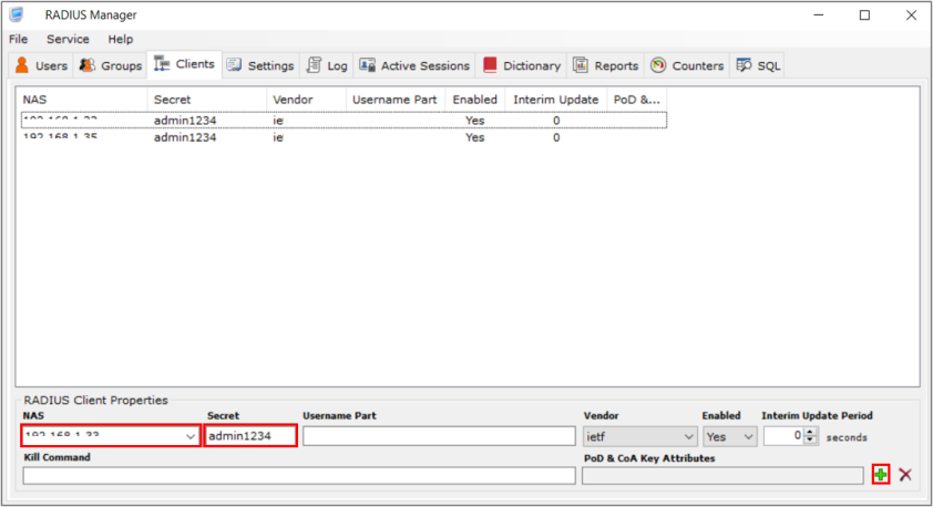 1 Configure the client list in the RADIUS server. In the example screen below, enter the management IP address of the Nebula Device in NAS. Enter the shared Secret (password) in your Site-wide > Configure > Switches > Authentication screen. Then click the add (+) button.