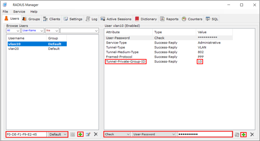 2 Create a user with dynamic VLAN attributes in the RADIUS server. In the example screen below, 10 in the Tunnel-Private-Group-ID is the value of the dynamic VLAN of this user account.