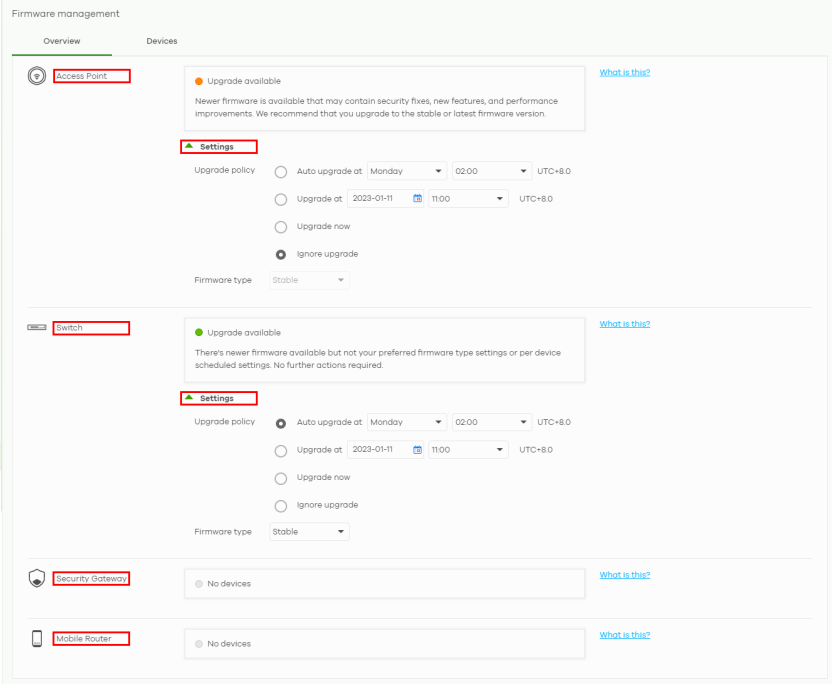1 Go to the Site-wide > Configure > Firmware management > Overview screen. Under Settings, you can set different times to upgrade firmware for your Access Points, Switches, Security Routers, Firewalls, Security Gateways, and Mobile Routers in your site. Select the day and time of the week when NCC will detect if any new firmware is available. NCC will send out a reminder email to the administrator for the available updates. If the administrator does NOT perform the update, after the set period of time is over, NCC will automatically upgrade the firmware for the Nebula Devices in the site. Or select Upgrade now to upgrade immediately.