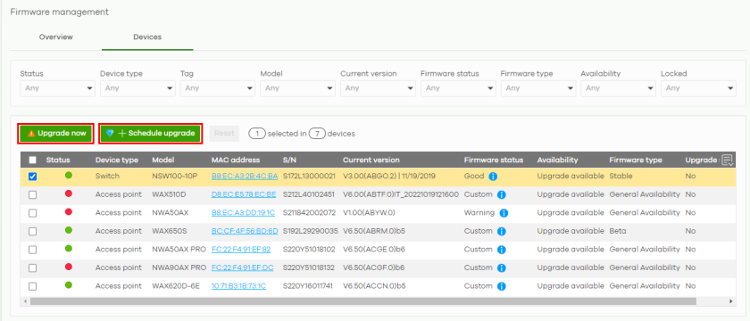 Upgrade now options can be enabled only when the selected Nebula Devices have a new firmware available.