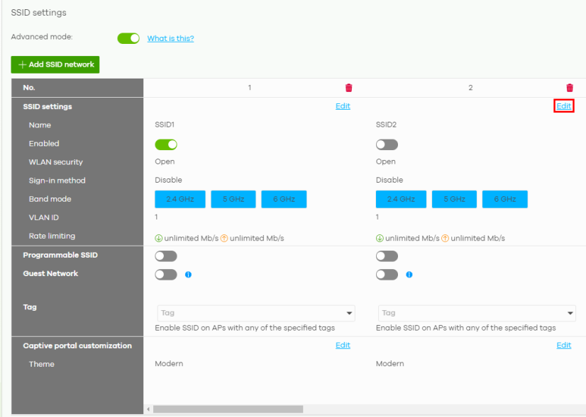 2 Click Edit on SSID2 to go to the Site-wide > Configure > Access points > SSID advanced settings screen.