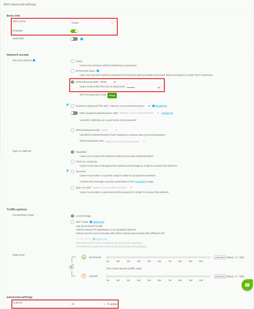3 Enter a name for this WiFi network for identification purposes (for example, Guest). Click Enabled to turn on this WiFi network. Select WPA Personal With (WPA2) and enter a pre-shared key from 8 to 63 case-sensitive keyboard characters in Users must enter this key to associate to enable WPA2-PSK data encryption. Enter the ID number of the VLAN to which the SSID belongs (for example, 20).