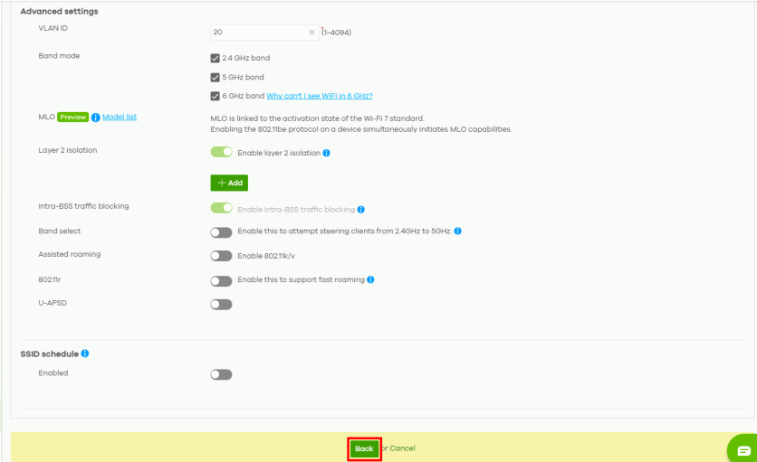 5 Click Back to save your settings for the Guest SSID to the NCC and return to the Site-wide > Configure > Access points > SSID settings screen.