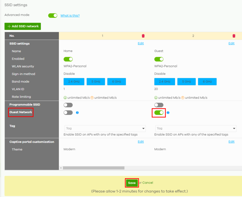 6 Activate the Guest Network for the Guest SSID and click Save.