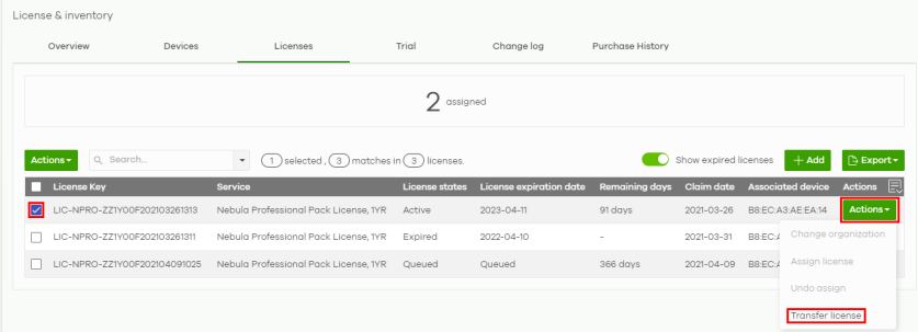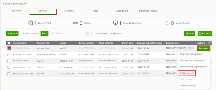 To assign a license(s) to a Nebula Device in the new organization, do the following: