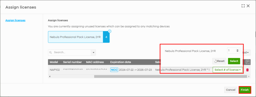 6 Click Select # of license. In the pop-up window, confirm or edit the value appearing beside the license type based on the criteria set in License assignment mode. Click Select to confirm. Then click Finish.