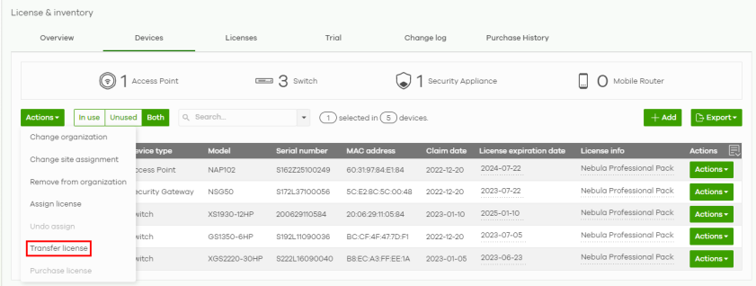 To transfer a license(s) to a Nebula Device in the new organization, do the following:
