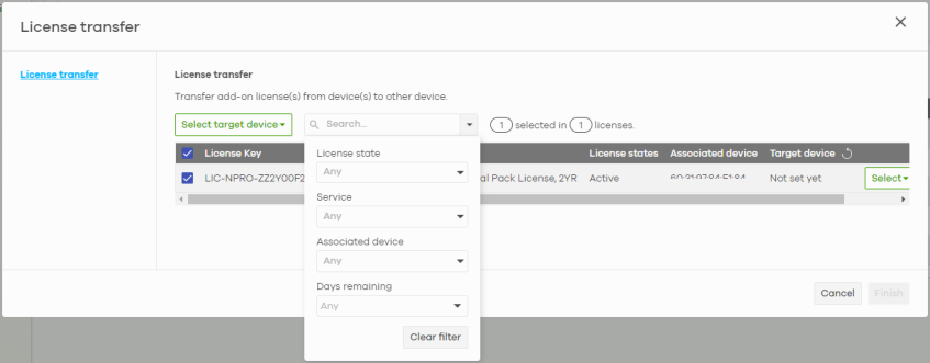 A license assigned to an organization and Nebula Device can be transferred to another Nebula Device in the same or different organization. The following guidelines apply when transferring licenses:
